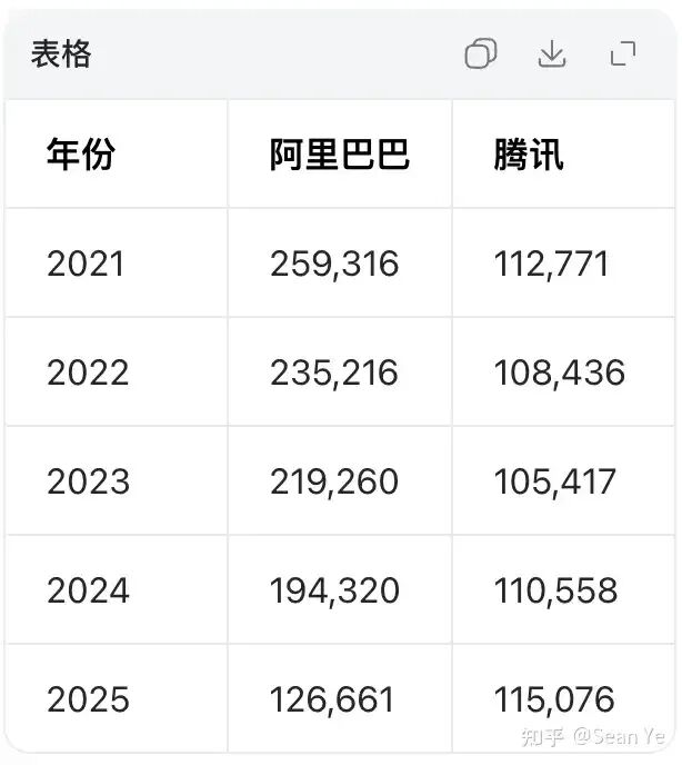 阿里掉得更离谱(部分业务出售导致人员骤降),腾讯也在缩减。