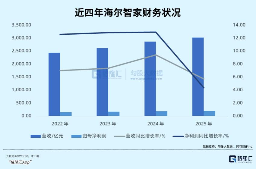 但对比2022年至2024年,这三年间海尔智家净利润增速均超过10%,2025年的业绩,就相形见绌。