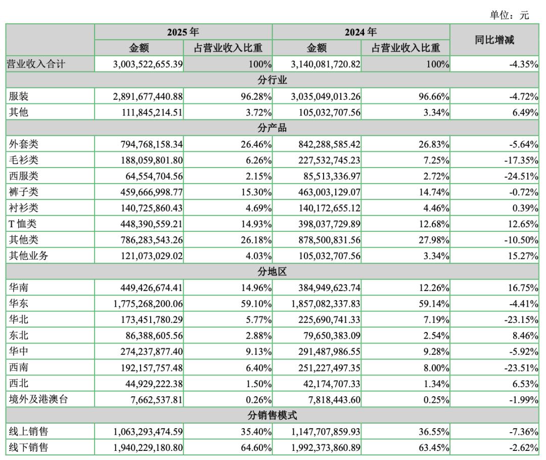具体来看,2025年,七匹狼的营业收入达到了30.04亿元,较2024年减少4.35%,其中服饰业务营收达到28.92亿元,占总营收比重的96.28%,同比降低了4.27%。公司的强势品类外套类产品营收达到7.95亿元,占比26.46%,同比降低了5.64%。