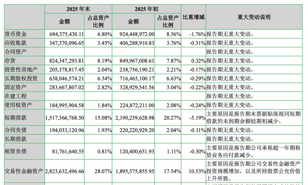 到2025年末,七匹狼的交易性金融资产金额已经达到28.24亿元,占总资产比例的28.07%,较2025年初时的18.96亿元进一步提升,公司解释称主要原因是报告期内公司交易性金融资产投资规模增加,以及所持股票公允价值上升所致。