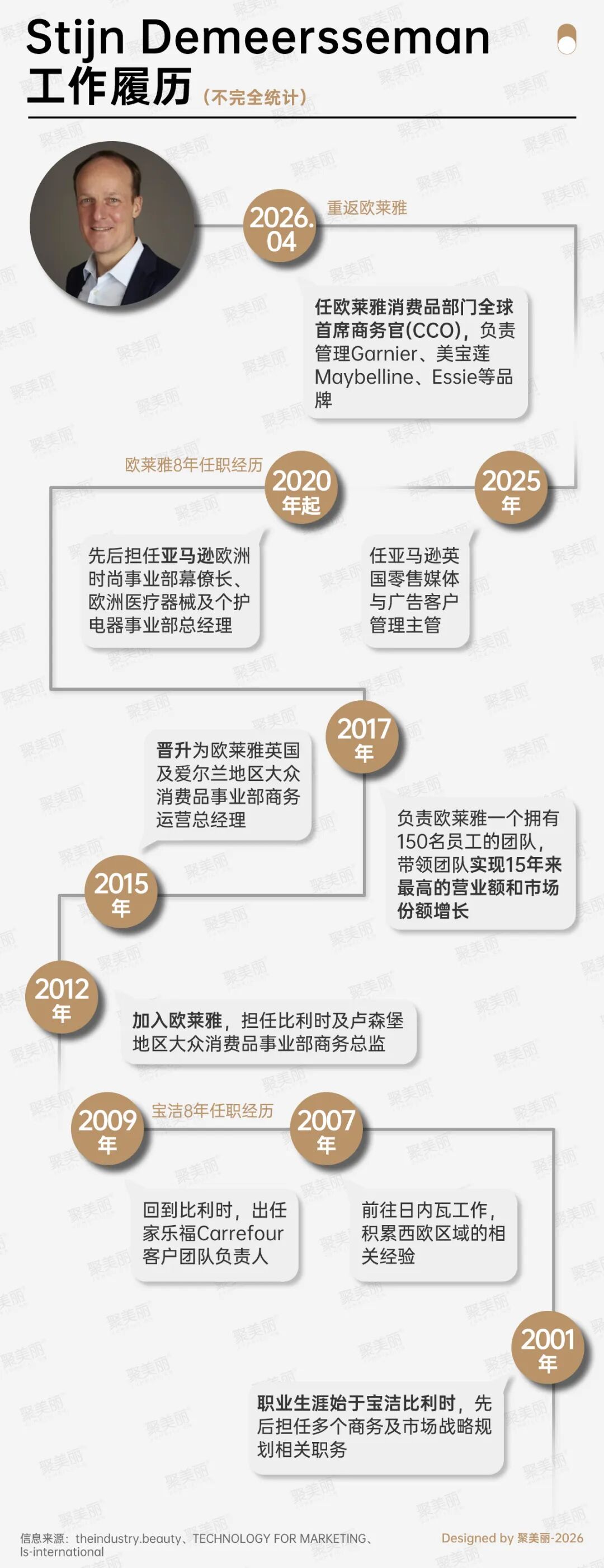 上述可见,Stijn Demeersseman这位兼具宝洁系、欧莱雅系人才属性的高管,不止具有美妆行业的经验,还跨界亚马逊这一零售渠道,拥有了电商运营、跨境零售等能力,而这或许也是欧莱雅召回这一“老将”的原因之一。