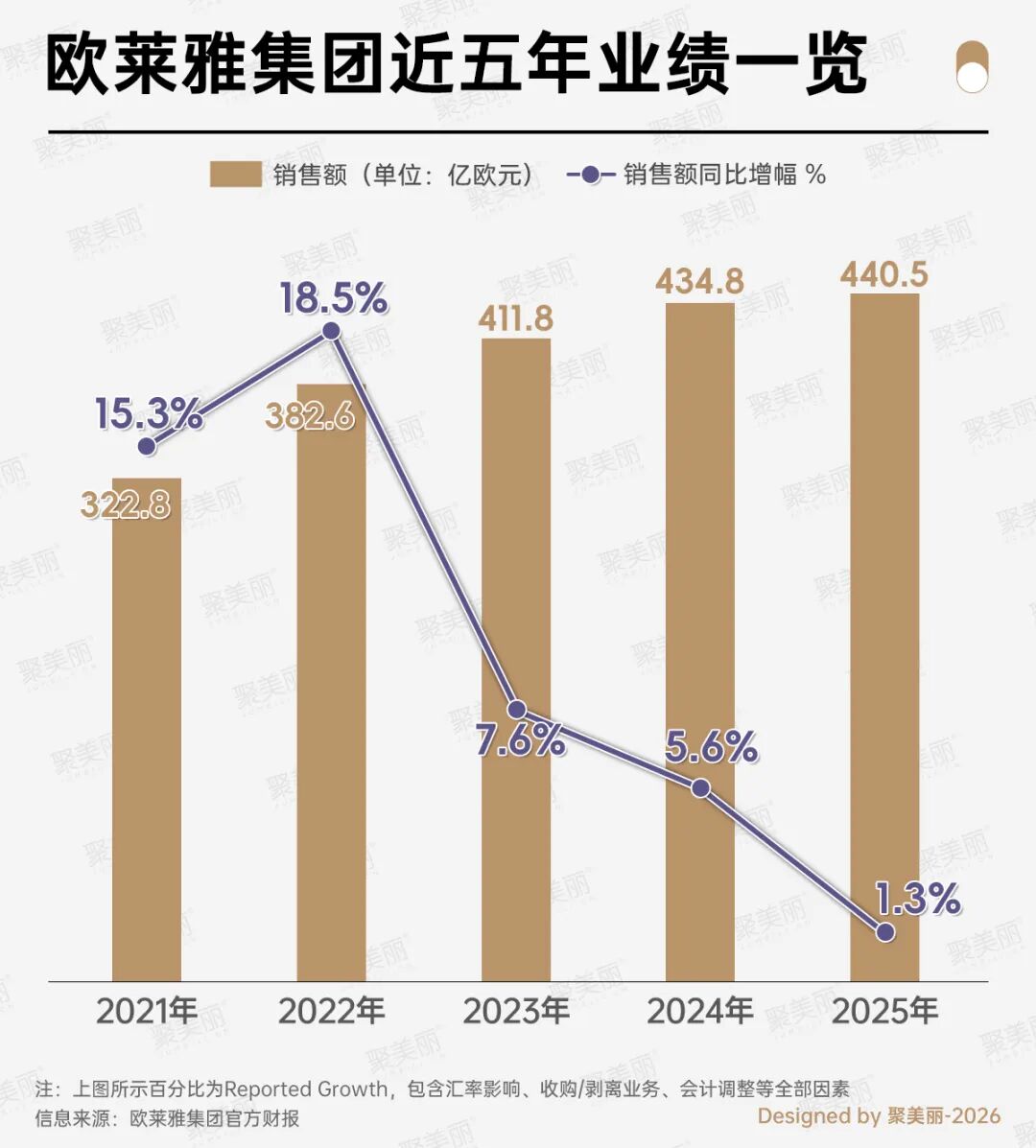 回顾近5年业绩,欧莱雅集团2021年、2022年销售额同比分别增长15.3%、18.5%,自2023年增幅呈个位数增长后,增速曲线便呈逐年放缓。