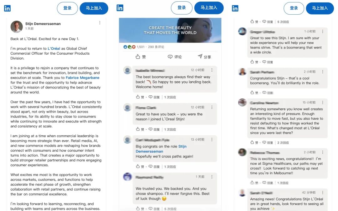 在其评论区,也有疑似欧莱雅集团高管及员工表示:“最好的回旋镖总是能找到回来的路”、“欢迎回家”、“你是我加入欧莱雅集团的原因”、“当我在2012年招募你时,我已经非常高兴了,14年后更是如此,欢迎回来”……