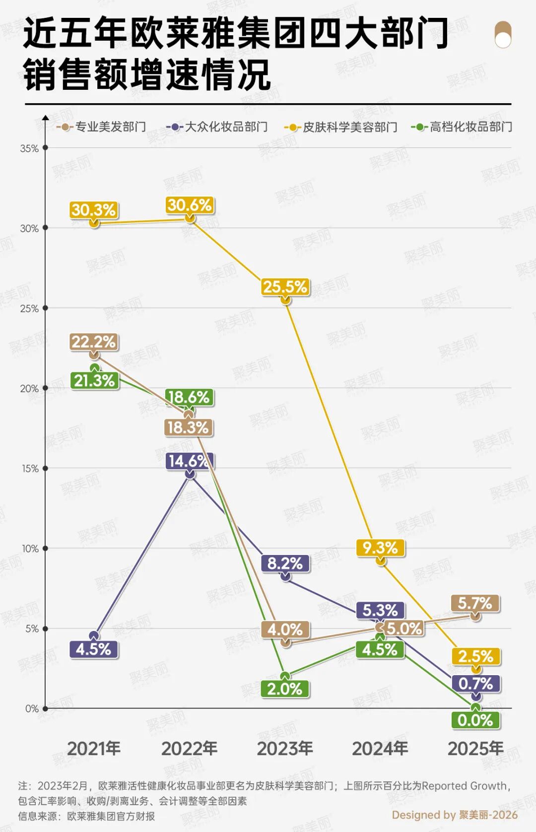 纵观欧莱雅集团各部门业绩,2021-2025年间,四大部门从双位数增长降至低个位数微增,增幅大幅放缓。
