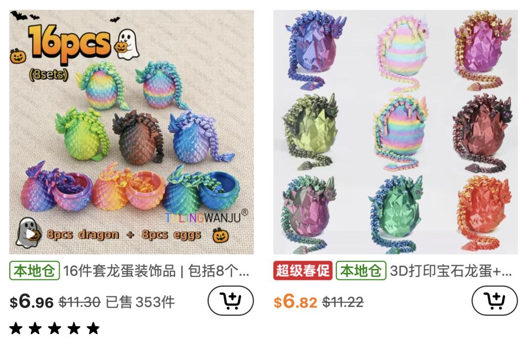 还有一种升级版的龙蛋,一颗蛋里面藏着一条可活动的小龙,外壳还有鳞片一样的纹理——这种嵌套结构用传统模具几乎不可能实现,但对3D打印来说不过是多设计几层而已。再加上盲盒玩法的加持,龙蛋在2023年底一度卖到脱销,直接催生了一大批3D打印农场的诞生。