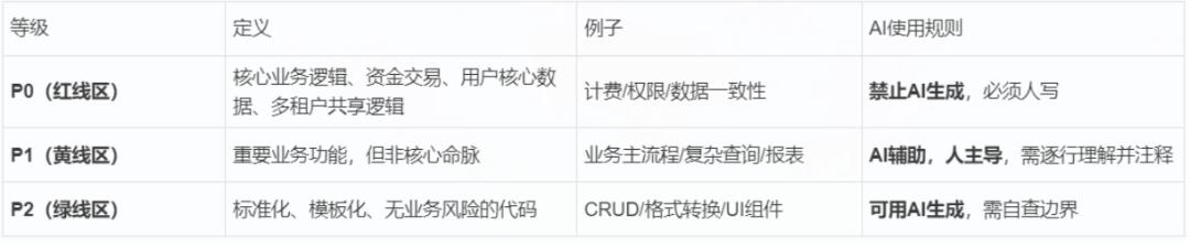 把系统里的功能按业务影响划分等级,不同等级对应不同的AI使用规则: