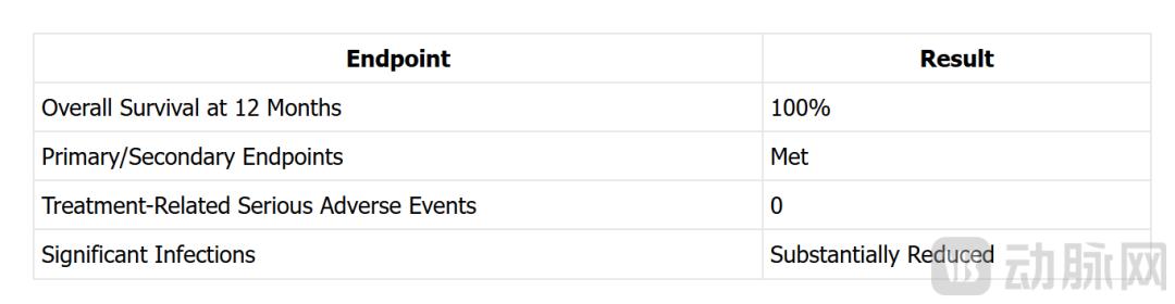 研究的主要终点为输注后12个月的生存率,以及中性粒细胞表面CD18和CD11a的表达水平。次要终点包括严重感染发生率、皮肤病变改善、伤口愈合能力等。