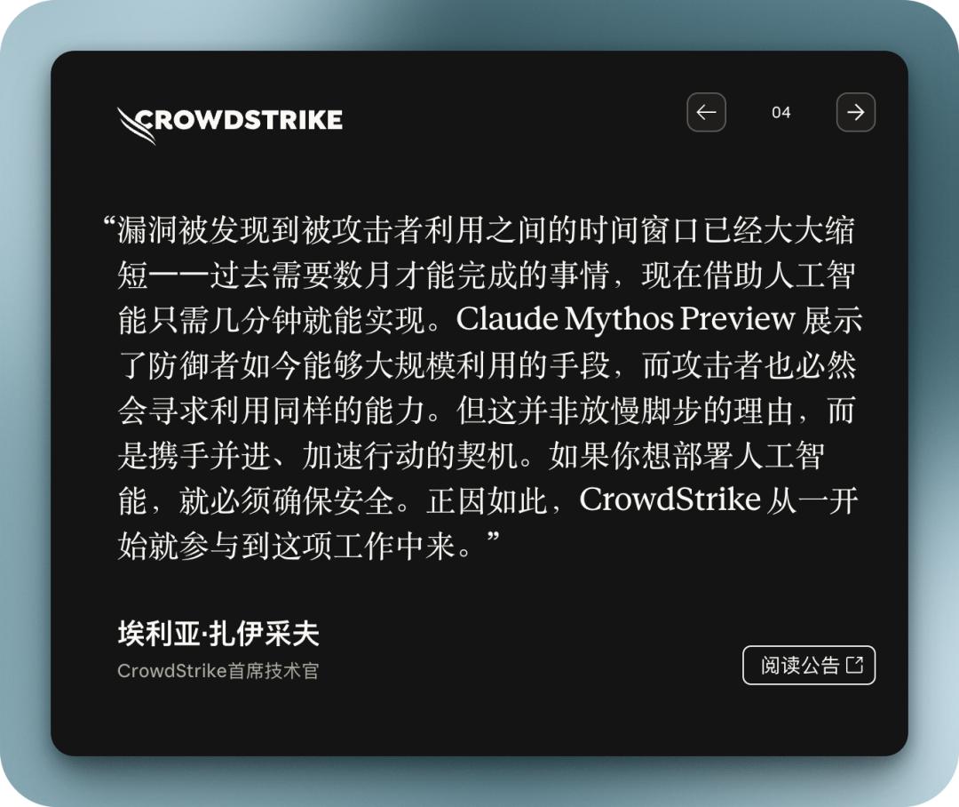 于是,A 社提出了 Glasswing 这个「内测计划」:与其把 Mythos 锁进保险柜,不如让潜在暴露风险最高的巨头公司和机构们先拿到它,扫描自己产品里的漏洞,在更大范围扩散之前把洞堵上。