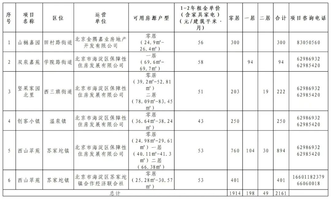 此次配租房源涉及6个项目,房源共计2161套。这些房源分布面也比较广,既有靠近诸多大厂的西三旗、学院路房源,也有西四环以及海淀山后地区的房源。既有零居(开间)、一居的小户型,也有两居房源。