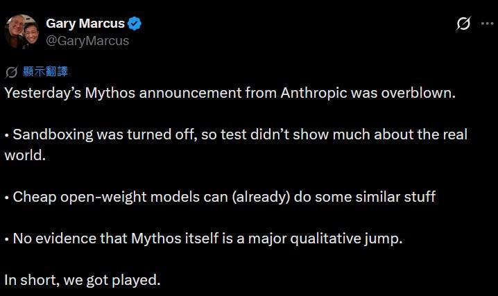 杨立昆在技术观点上的老对手、AI批评家、大模型怀疑论者、纽约大学教授加里·马库斯,今日凌晨的措辞稍温和些:“Mythos的炒作大部分是神话迷思(The Mythos stuff was mostly a myth)……攻破火狐浏览器时,浏览器的沙箱被关闭了。其他功能能被廉价的开放权重模型实现。没有证据证明Mythos本身是质变飞跃。简单讲,大家被耍了”。