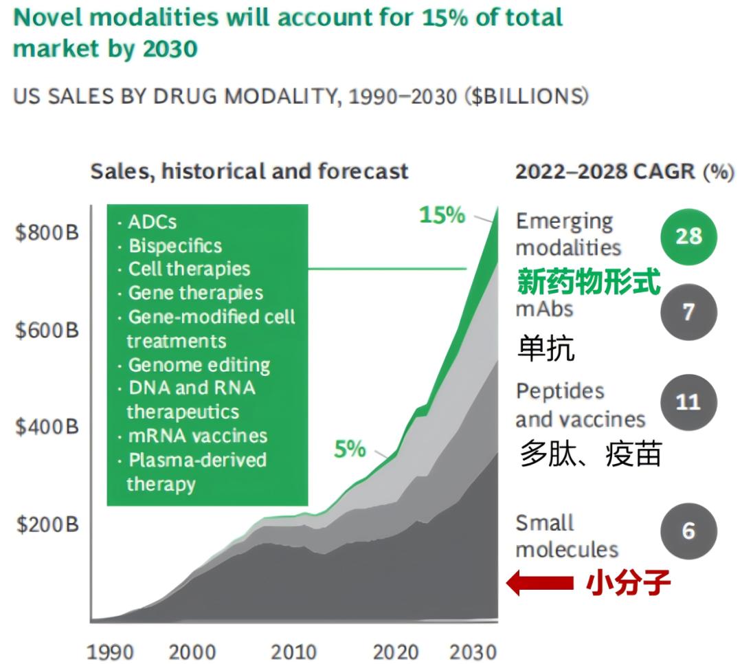 小分子药物在众多药物形式中发展历史最长、市场规模长期占据主导地位,但随着新药物形式逐渐兴起,其占比呈下降趋势(规模仍在增长)。