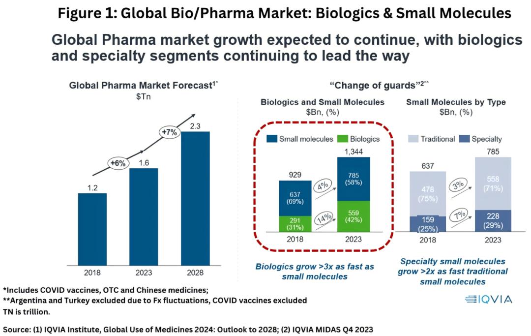 2018-2023年,全球药物市场从1.2万亿美元增长至1.6万亿美元,其中小分子药物市场从6370亿美元增长至7850亿美元(CAGR=4%),但占比从69%下降至58%。相应地,生物制剂从2910亿美元增长至5590亿美元(CAGR=14%),占比从31%上升至42%;