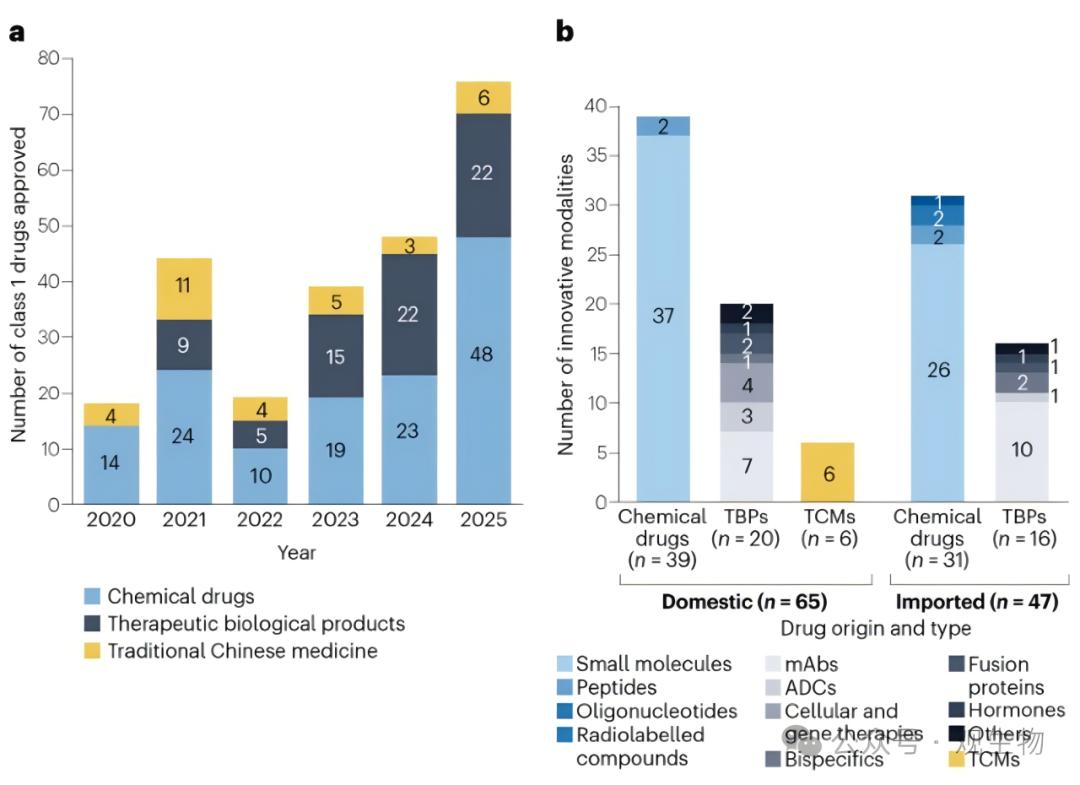 2020-2025年,中国NMPA获批新药中,小分子药物约占一半(2025年小分子获批新药占比有所提高,约63%,48/76)。