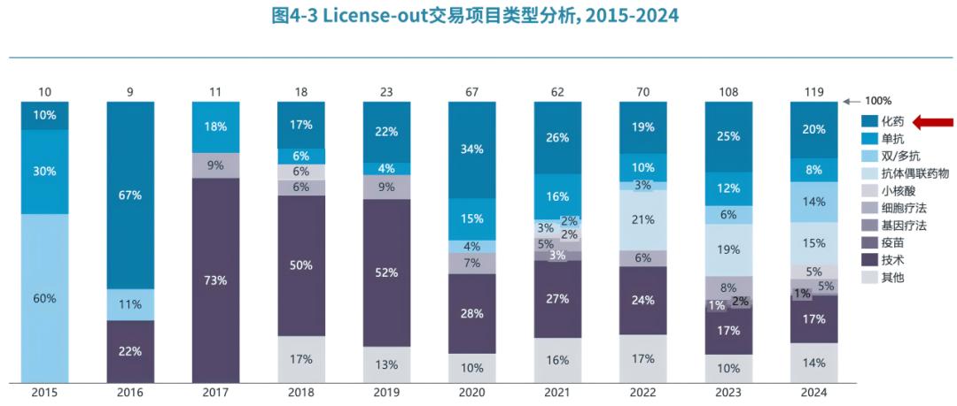 2015-2024年,中国创新药License-out交易项目类型中,小分子化药约占20-30%,相比小分子药物市场规模及获批药物数量占比(~50%),在研新药的BD交易中,小分子药物占比更低,呈现出新药物形式百花齐放、百家争鸣的状态。