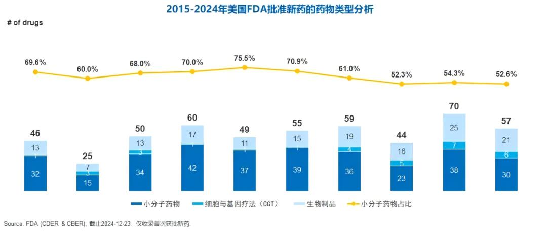 2015-2024年,美国FDA批准新药中,小分子药物数量占比由约70%逐步下降至约50%。
