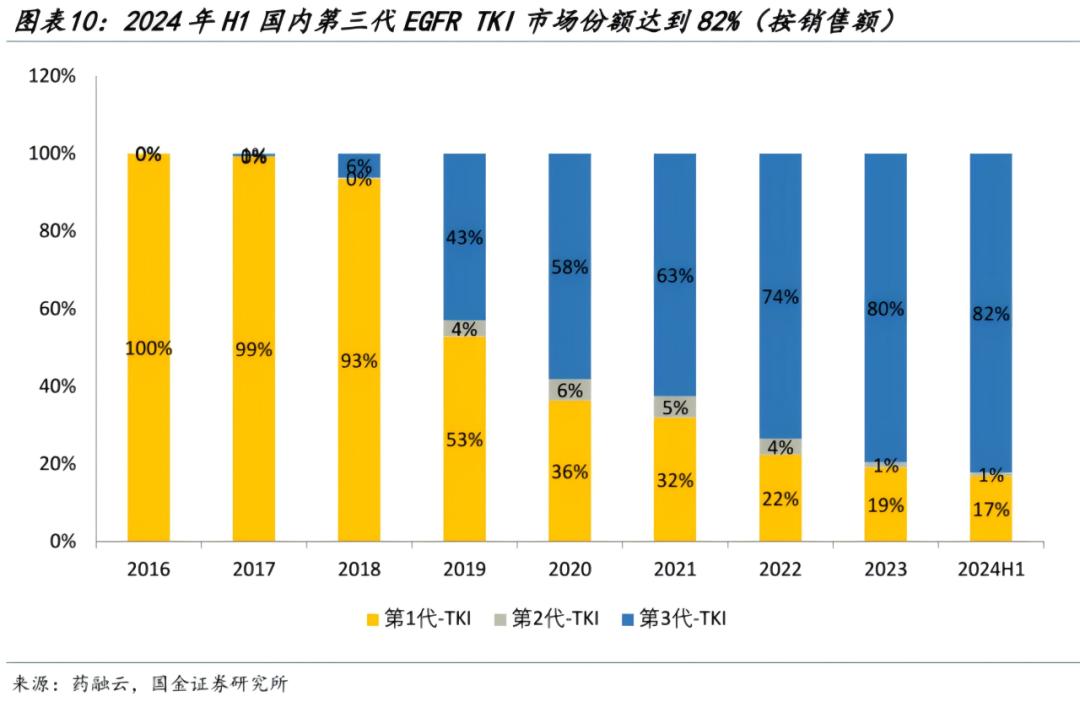 奥希替尼2017年在国内获批后,市场份额迅速扩大,目前三代产品已经进入一线治疗,占据超80%市场份额(二代产品同时抑制HER2,疗效和安全性未有明显提高,且很快三代产品问世,因此市场份额较低)。
