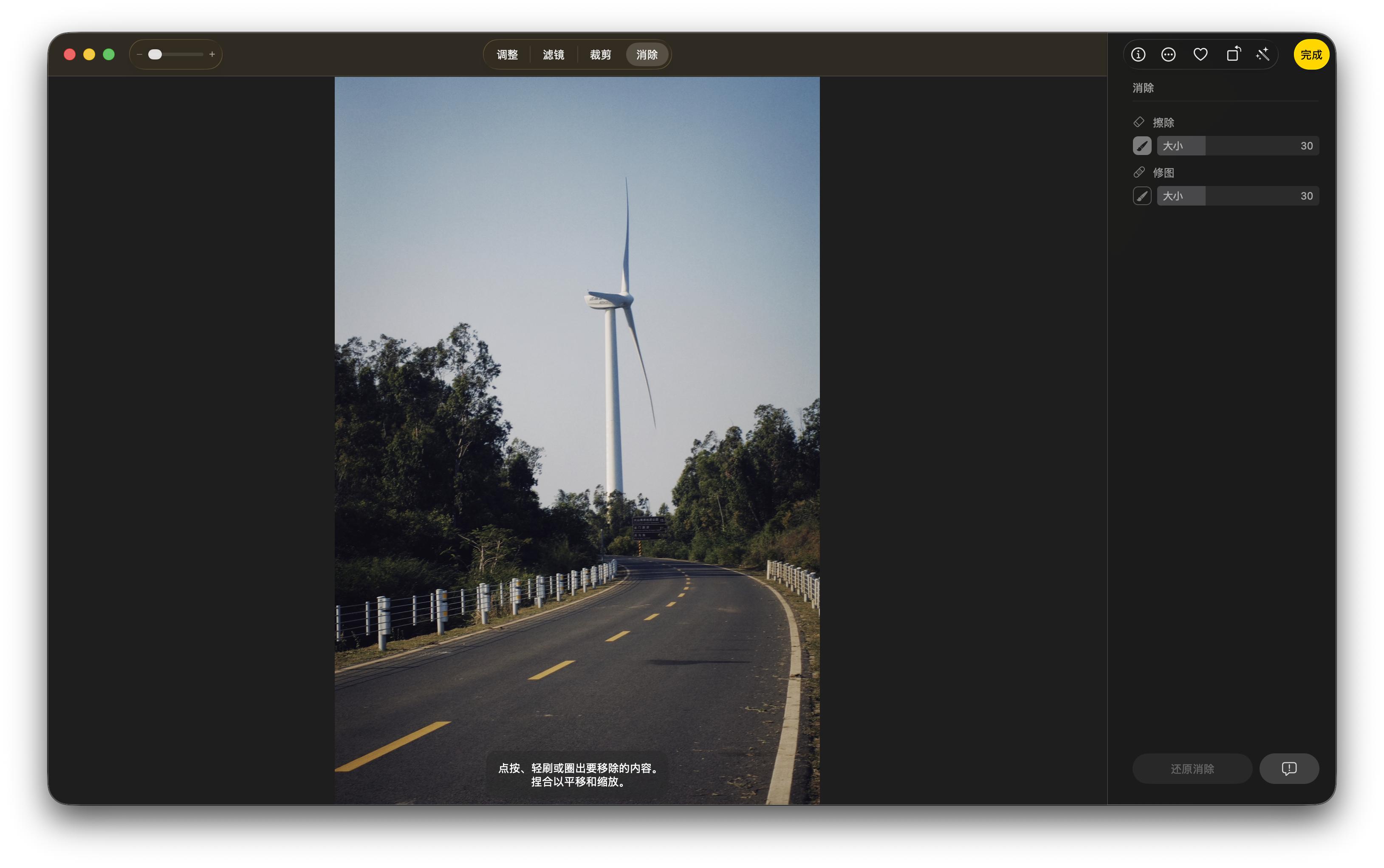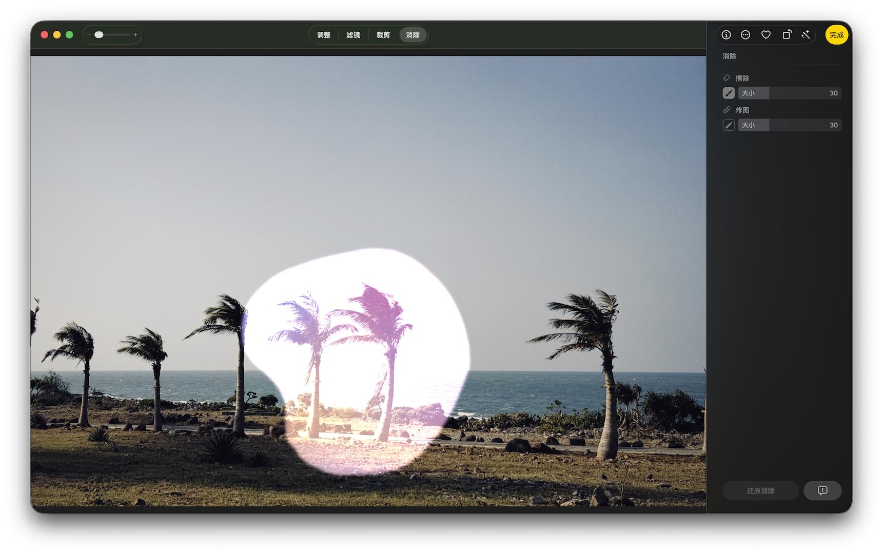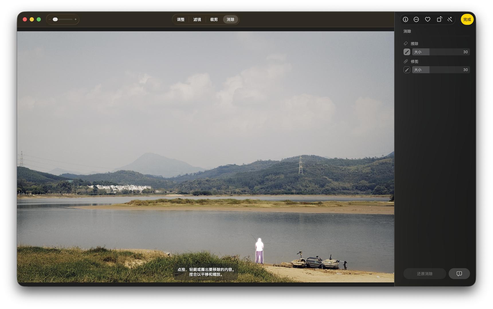 用法上 Mac 的 AI 消除和国产手机的 AI 修图也差不多:进入到 AI 消除模式后,苹果智能会先对画面做一个预识别,自动标示出可能需要消除的人或物。点击、圈选或涂抹需要消除的物件后,苹果智能会自动执行消除和填充的工序。