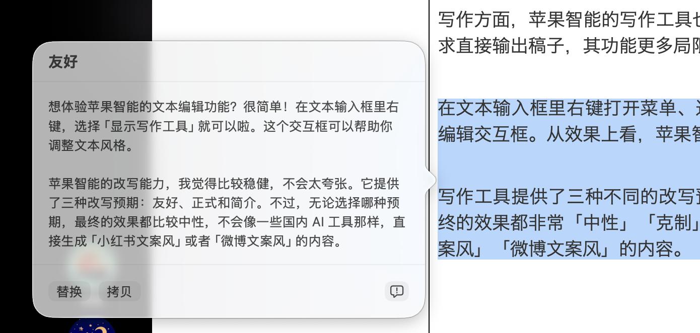 在文本输入框里右键打开菜单、选择「显示写作工具」,就能拉起苹果智能的文本编辑交互框。从效果上看,苹果智能的改写能力我认为「中规中矩」: