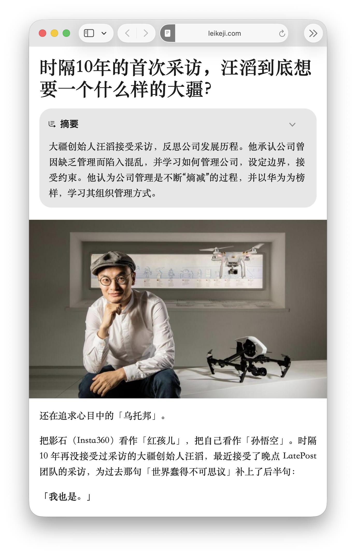 在看新闻稿或访谈文章时,智能摘要也快速总结文中的重点,对小雷每天早上找热点选题也挺有帮助。比较可惜的是,这个智能摘要只能生成对应原始语言的内容,不能直接集成翻译功能,需要手动选中二次翻译。在体验上还是离国产 AI 有一定距离。