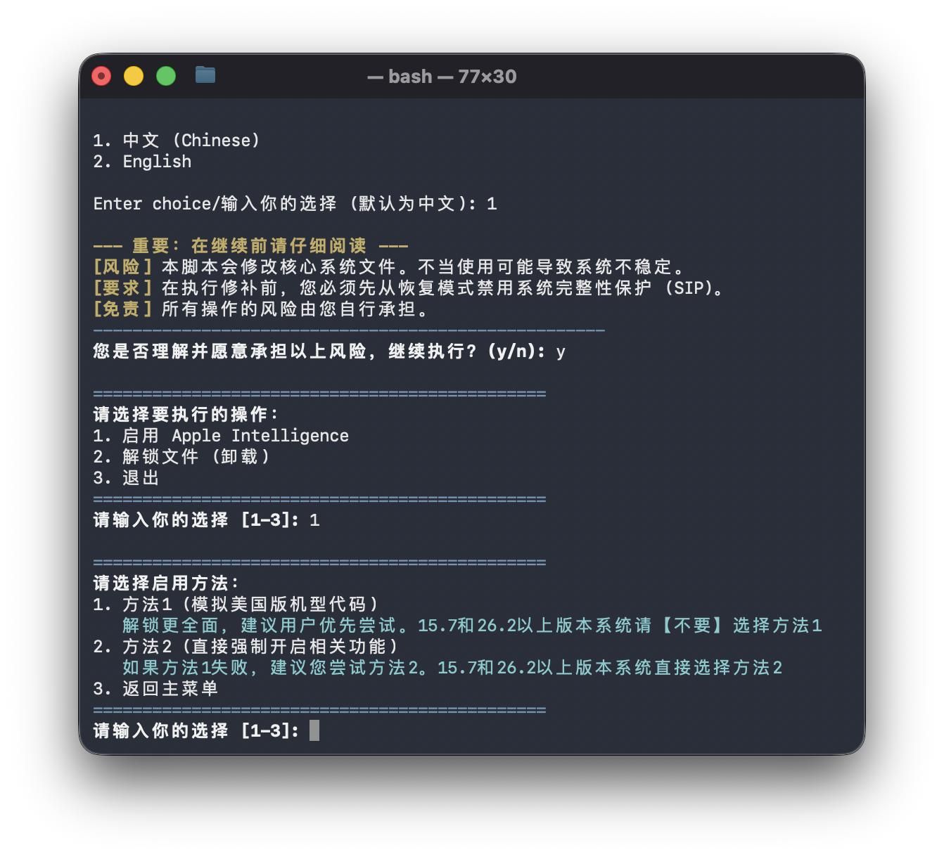 打开自动化脚本后,按照文本界面提示选择语言、需要执行的操作(启动、卸载)和启动模式,再输入电脑密码授权和确认,等屏幕出现成功的提示,就可以重启电脑了。