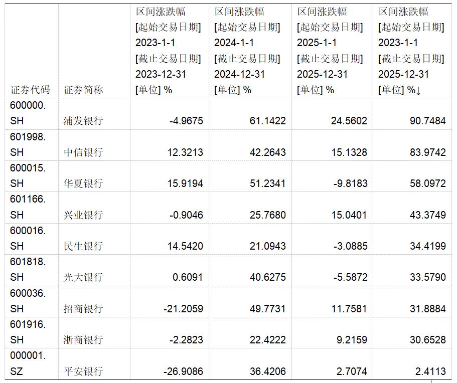 2023年至2025年,在银行股上涨的背景下,Wind数据显示,42家A股上市银行中,浦发银行、中信银行的股价上涨幅度分别91%、84%,处于上游位置。