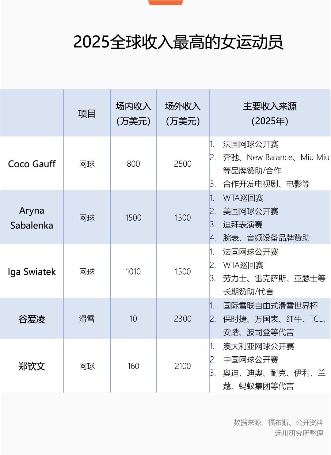 去年年底,福布斯公布了《2025全球收入最高的女运动员》,榜单总共20个人,有10个都是网球运动员,剩下4个篮球、2个高尔夫、2个滑雪、1个橄榄球和1个田径。