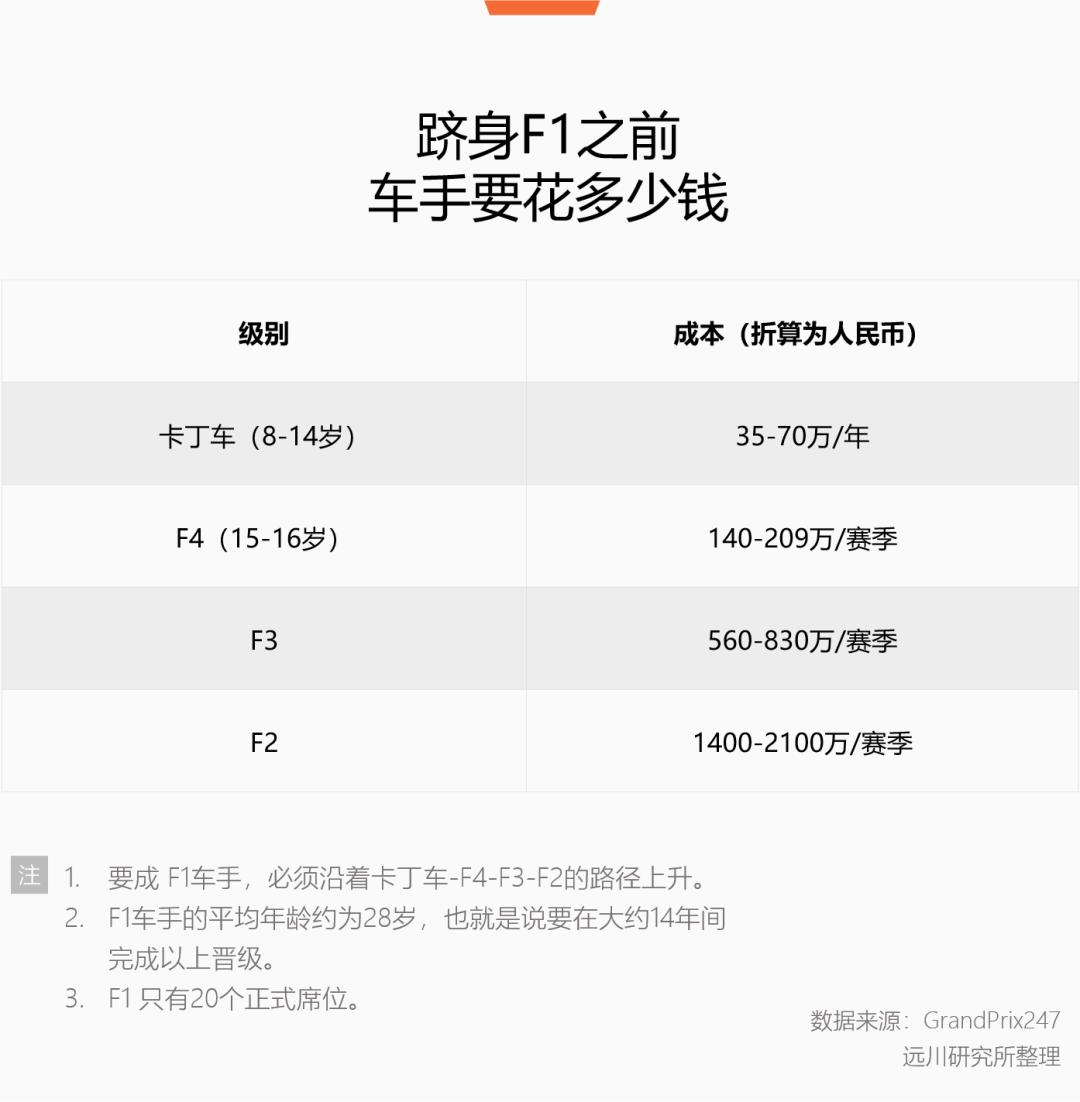 F1赛事媒体GrandPrix247曾经统计过培养一位车手的花费[4]。一位踩在F1门槛上的车手,每个赛季的成本动辄八位数起步。