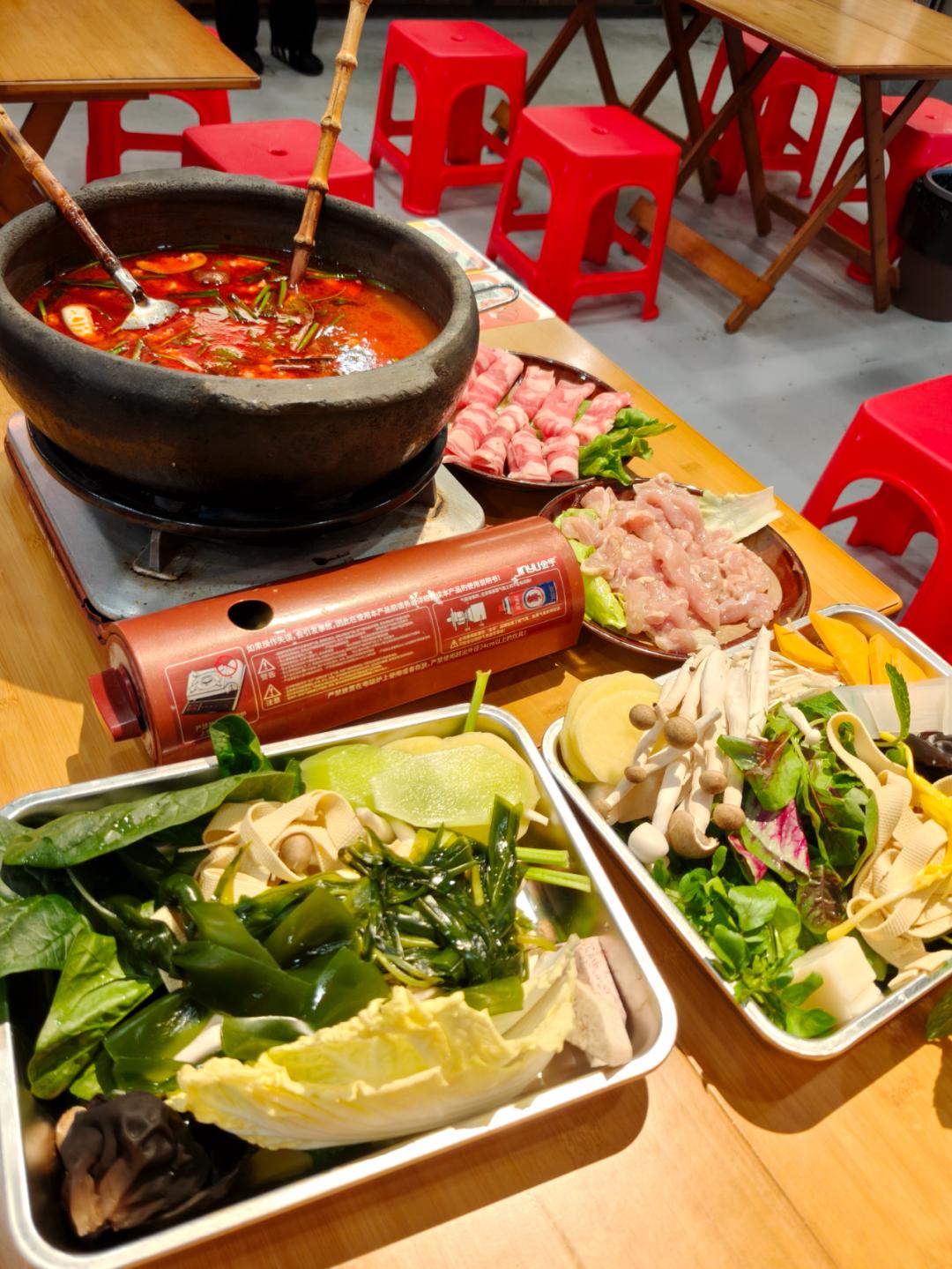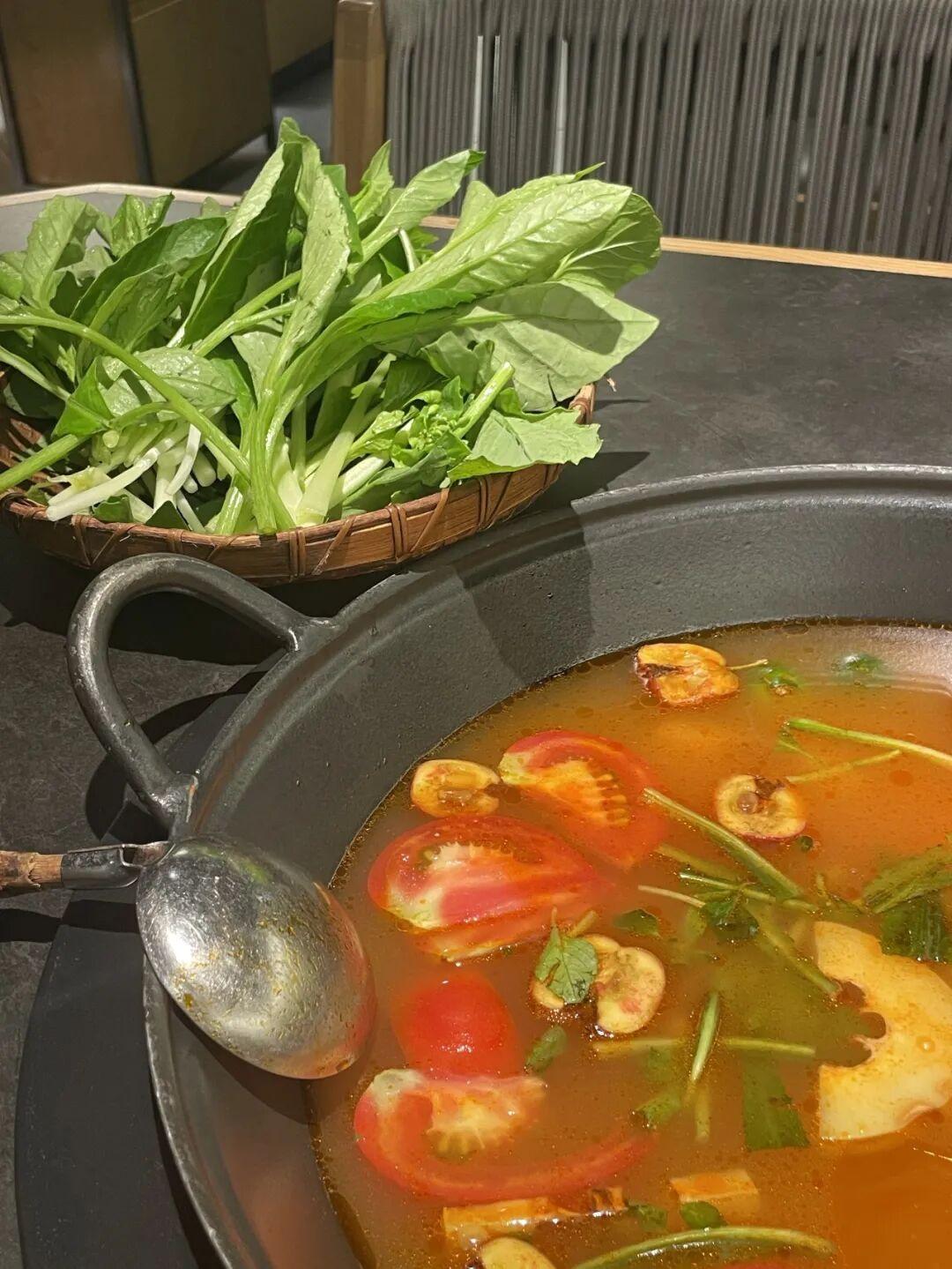 反观蔬菜自助火锅,打工人可以只花正经吃一顿火锅一半的钱,就能拥有一顿普通火锅的完整体验,这不仅省去了攒局拉人的烦恼,且全程不用社交。走进去就假装自己在云南或贵州的山里涮野菜,锅底选个酸汤或菌汤,蘸料少放点酱,四舍五入就算是亲手打造了一份不难咽下的“健康餐”。