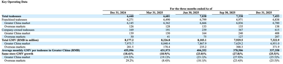 但客观地说,海外业务对整体业绩的拉动有限,占整体GMV的比重仅为5%左右。霸王茶姬的海外门店,现在也尚未形成健康的发展趋势,比如从同店GMV指标并不优秀。