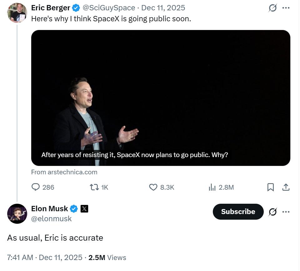 同年12月11日,Ars Technica记者发文分析“SpaceX为何很快将上市”,并在X上分享。