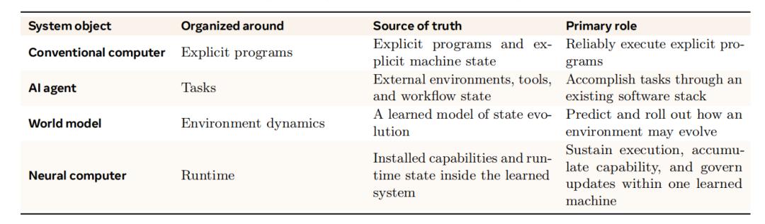 为了明确 NC 在计算图谱中的独特位置,研究团队将其与其他系统对象进行对比:传统计算机执行显式程序,AI Agent 操作外部执行环境,世界模型仅负责预测环境动态,而神经计算机的独特之处在于它直接将运行时本身视为一台计算机。