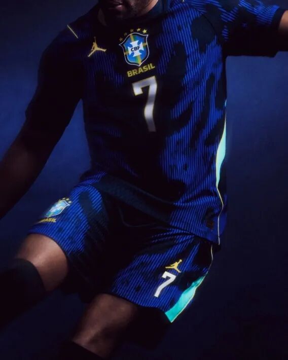 球衣设计本身也极具话题性。这款球衣以深蓝和黑色竖纹为主基调,融入Jordan标志性的爆裂纹,灵感源自亚马逊箭毒蛙。更耐人寻味的是设计背后的哲学,Jordan品牌服装设计总监Mackenzie Sam将其概括为“快乐的威胁”(the threat of joy):“当巴西球员在球场上微笑时,那其实是他最危险的时候,也是顶级掠食者真正出现的时候。”