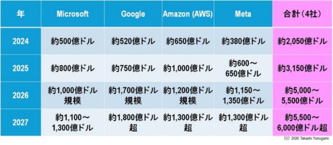 现阶段,整个人工智能行业的增长前景已受到根本性动摇。仅上述四家企业的市值总和就超过8万亿美元(约合1200万亿日元),若人工智能服务器供应长期停滞成为现实,市场对行业增长的预期将大幅下降,进而面临1万亿至2万亿美元(约合150万亿至300万亿日元)的市值损失风险。