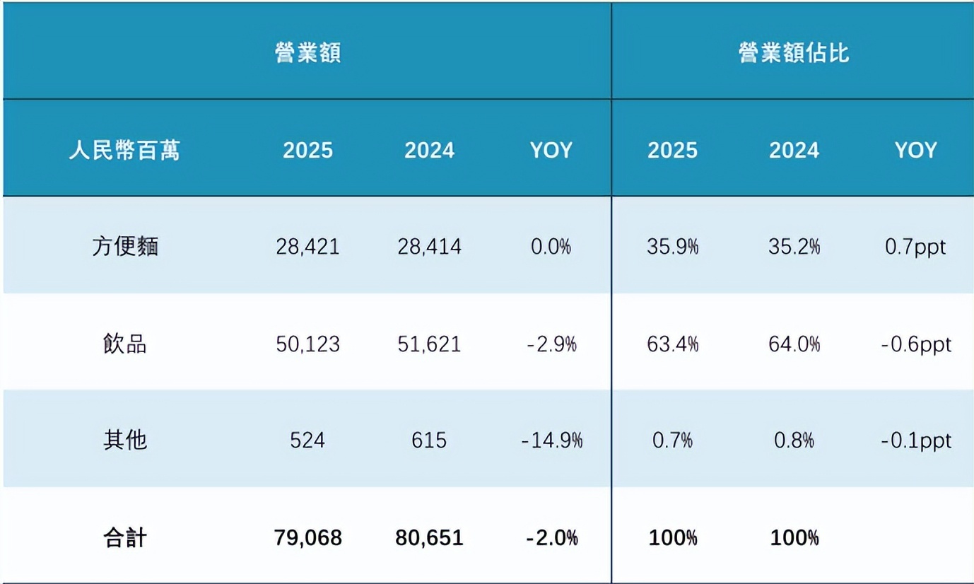 而饮品业务的增长承压,并非康师傅一家面临的难题。2025年统一饮品业务实现收入194.71亿元,同比仅增长1.2%,增速较上年大幅回落7个百分点,同样面临增长乏力的困境。