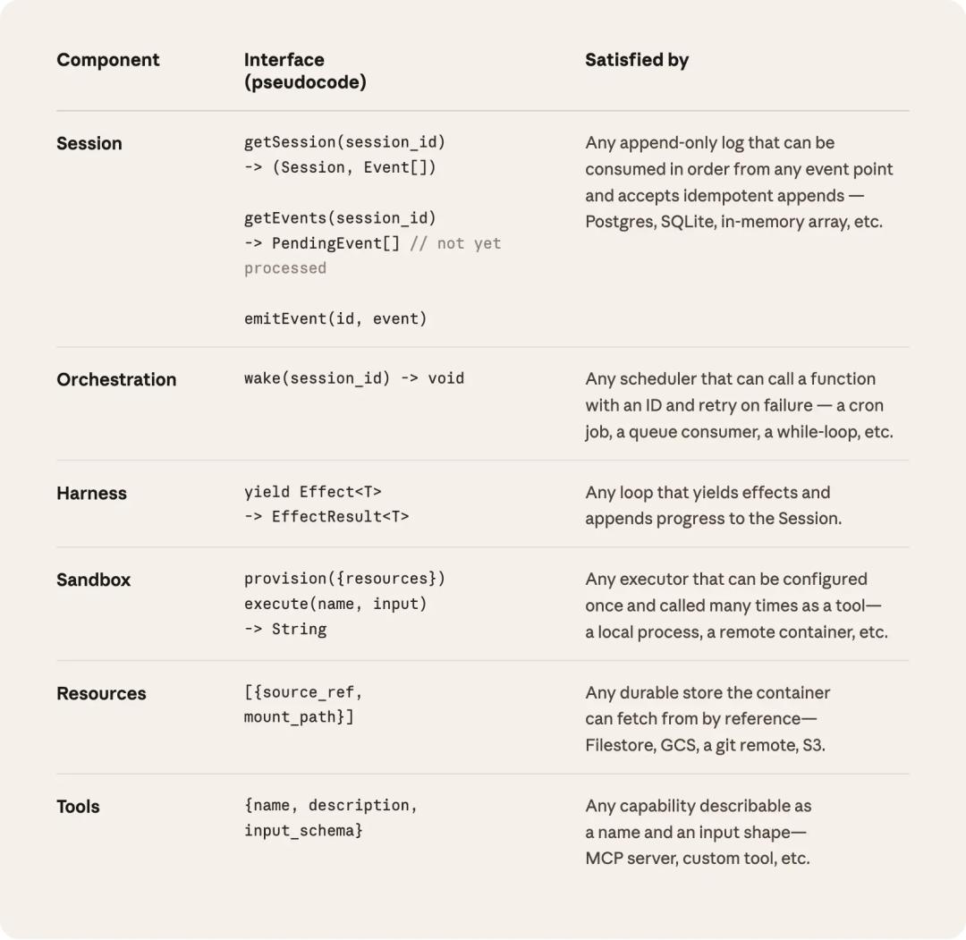 Managed Agents将Agent拆解为三个标准组件,这种设计思路直接致敬了70年代的Unix 操作系统。