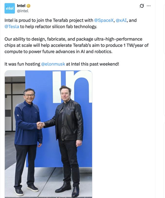 马斯克需要英特尔的制造经验;英特尔需要马斯克的需求规模和叙事能量。两家公司彼此都清楚对方的弱点,也都清楚自己的筹码。