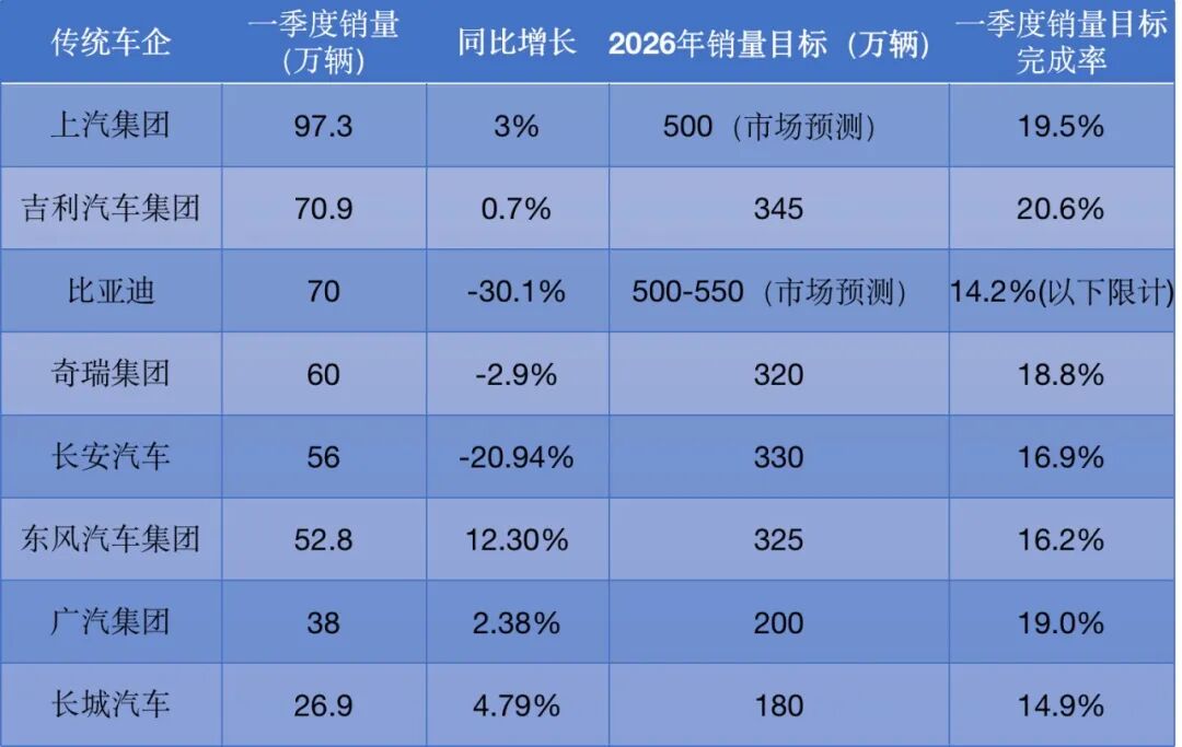 从年度销量目标完成率来看,形势更为严峻。在经济观察报统计的近20家主流传统车企与新势力车企中,仅极氪一家的完成率超过25%(为25.7%),其余十余家均在20%以下。完成率垫底的为零跑、小鹏、深蓝,均仅完成全年目标的11%左右。