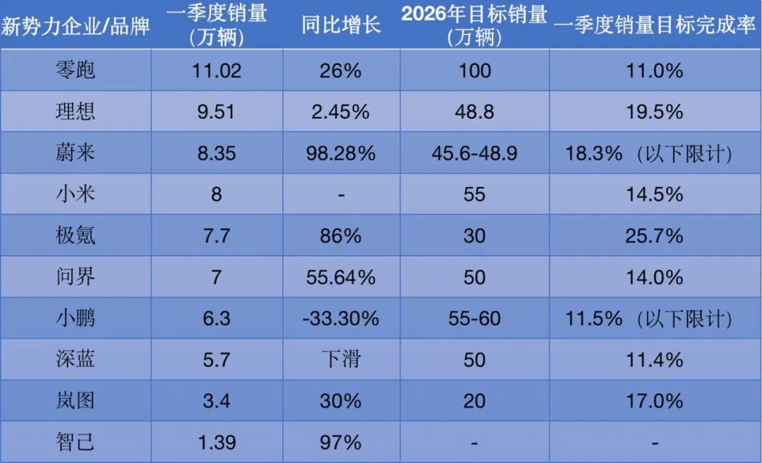 其余几家车企/品牌的表现承压。其中,小米汽车未公布一季度的具体销量,但根据其此前公布的1月交付量超过3.9万辆、2月交付量超过2万辆、3月交付量超过2万辆,估算小米汽车一季度累计交付约8万辆。小米汽车2026年的销量目标为55万台,一季度的完成率仅为14.5%。这意味着,小米汽车要完成年度销量目标,接下来9个月月均交付需超过5.2万辆,挑战巨大。