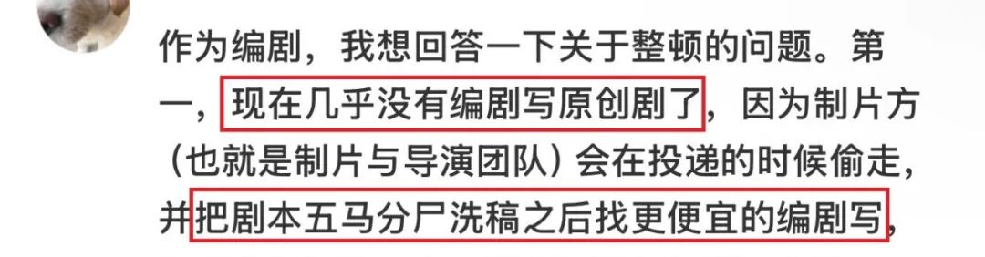 最直观的,莫过于原创被窃取、劳动被白嫖。按照他的说法,现在写原创剧的编剧已经几乎没有了,因为原创剧本在投递阶段就可能被“偷走”,在经过“五马分尸”的洗稿后找更便宜的编剧写。在创作保护约等于零的现实下,编剧维权无门,只能被迫放弃原创剧本,转向IP改编。