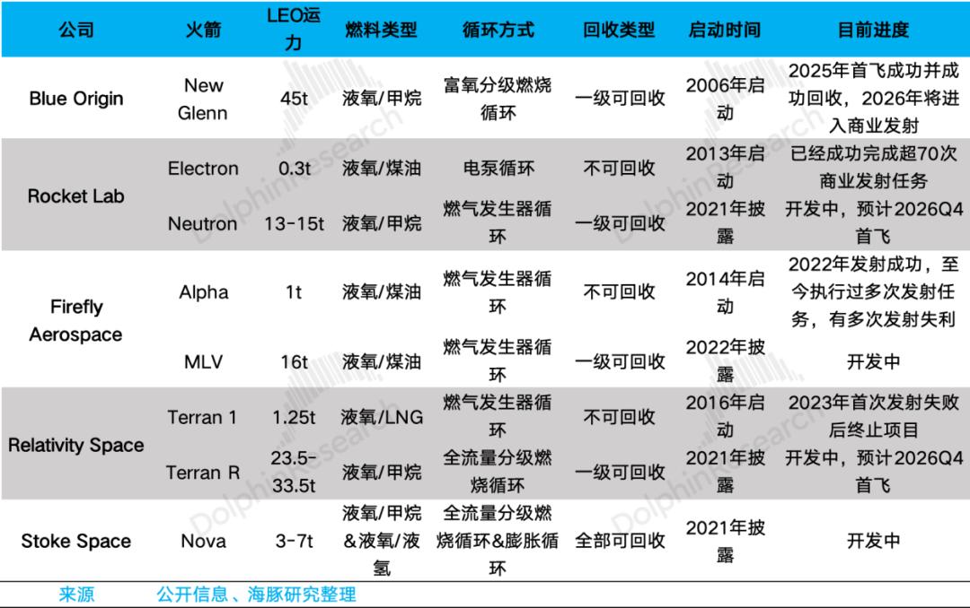 可以看到,从进度节奏来看,除Blue Origin以外,Firefly Aerospace、Relativity Space、Stoke Space这几家行业主要参与者进度均较慢,其中Relativity Space、Stoke Space几乎没有发射成功的经验。