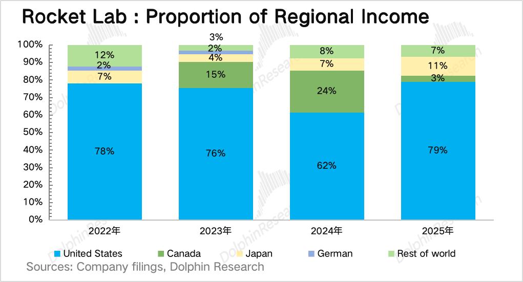 加拿大收入主要来自Rocket Lab所收购的加拿大公司Sinclair Interplanetary销售反作用轮、星象追踪器等零部件所产生的收入,客户包括加拿大航天巨头MDA Space等。