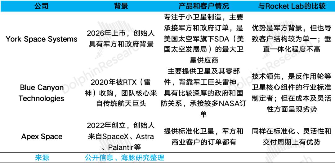 (1)垂直一体化叠加管理能力,所带来在交付效率和成本方面的领先优势,这一点York Space Systems和Blue Canyon Technologies都有劣势,而Apex Space在垂直一体化方面也不如Rocket Lab;