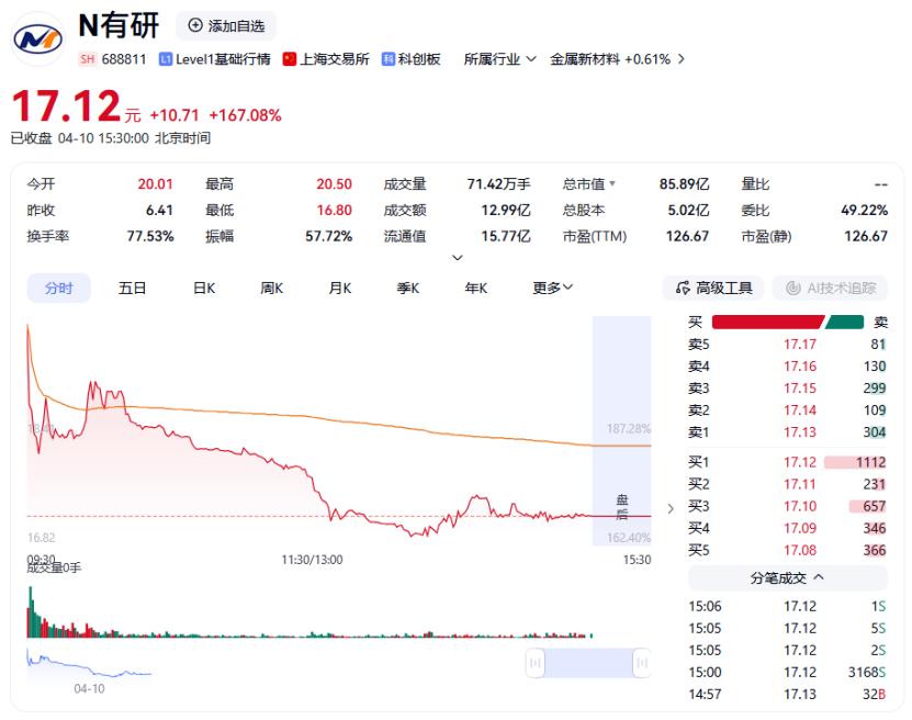 今日(4月10日),有研复材在上交所科创板上市。截至收盘,该股报17.12元,涨幅167.08%,成交额12.99亿元,换手率77.53%,振幅57.72%,总市值85.89亿元。
