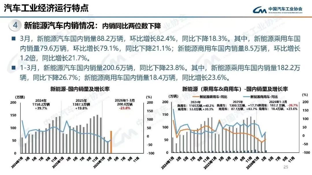 其中,新能源汽车销量下降幅度高于大盘。今年一季度,新能源汽车国内销量200.6万辆,同比下降23.8%。其中,新能源乘用车国内销量182.2万辆,同比下降26.7%。