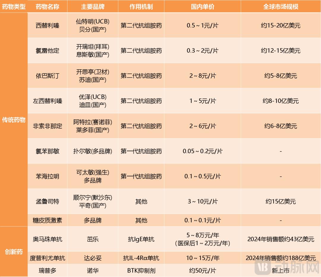市场上常见的慢性荨麻疹药品数据来源:根据公开信息整理