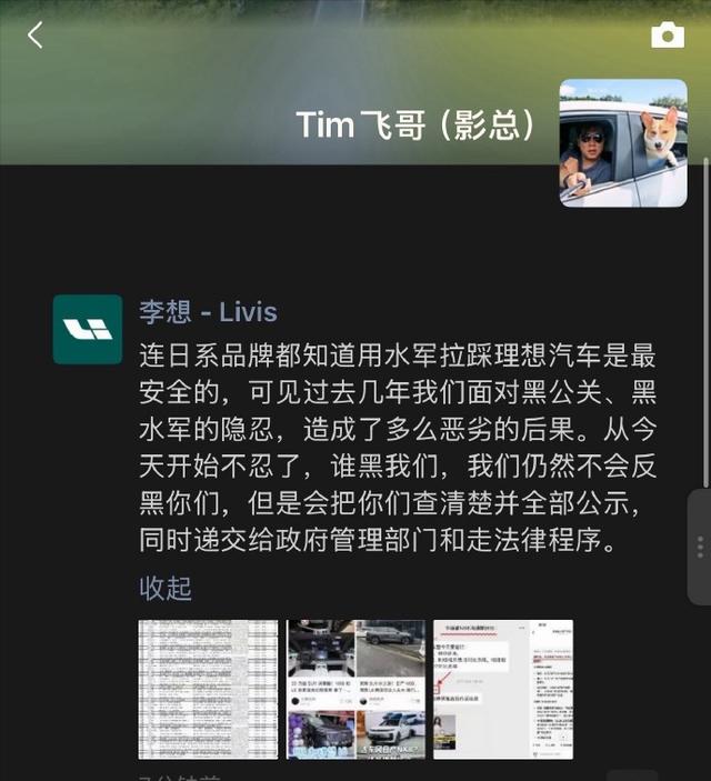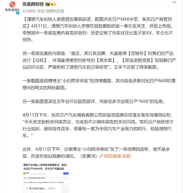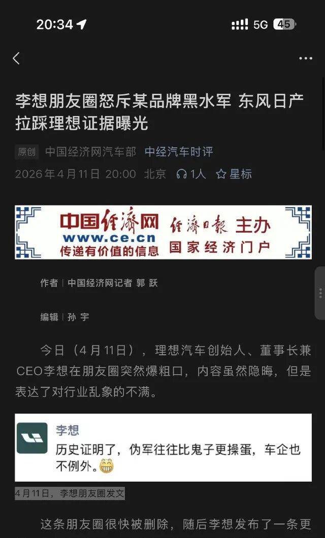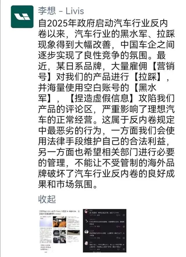 4月11日,理想汽车创始人李想在朋友圈突然爆粗口,这条朋友圈很快被删除,随后再次发布了另一条,称“某日系品牌,大量雇佣【营销号]对我们的产品进行【拉踩】并海量使用空白账号的【黑水军】,【捏造虚假信息】攻陷我们产品的评论区,严重影响了理想汽车的正常经营。这属于反内卷规定中最恶劣的行为。