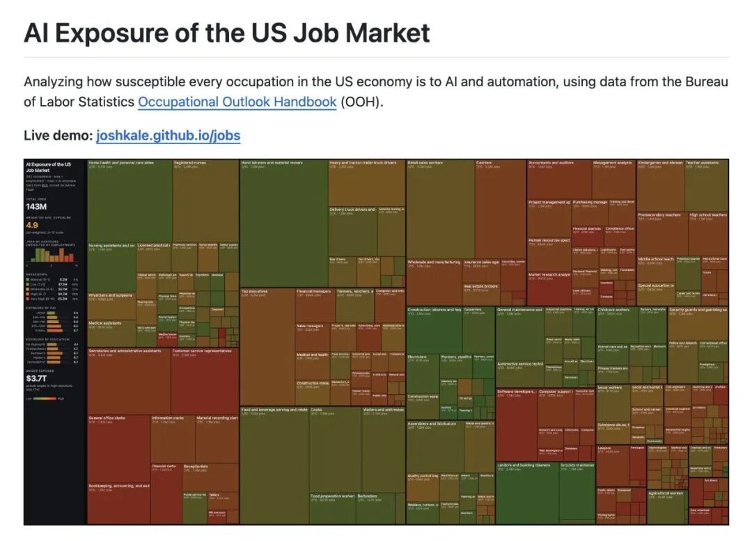 Andrej Karpathy 前不久对美国不同职业的「AI 暴露度」做了量化:大约 42% 的职业处在较高 AI 暴露度区间,横跨多个领域,以白领工作为主。
