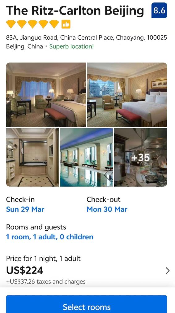 前段时间,美国朋友Mike在WhatsApp上发给我一张booking截图,图上是他想预定的北京丽思卡尔顿酒店,一晚250美元还含早餐。