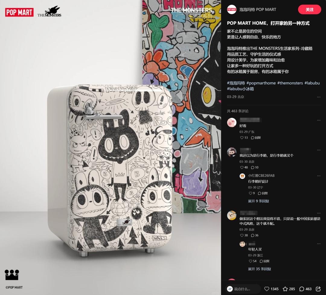 上月底,泡泡玛特在小红书上发了一条帖子,展示了一款名为「THE MONSTERS 生活家」的冷藏箱产品:箱门上印着 LABUBU 和 TYCOCO 的卡通形象,门把手处有一个 LABUBU 的立体装饰,整体造型小巧,走的是复古风格。帖子下面,粉丝的反应相当热烈。