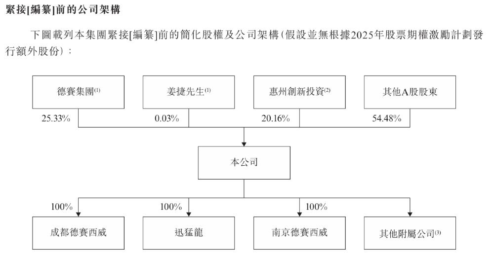 股权架构上,截至最后实际可行日期,德赛西威由德赛集团持有约25.33%及由姜捷直接持有0.03%,惠州创新投资持有20.16%,其他A股股东持股54.48%。